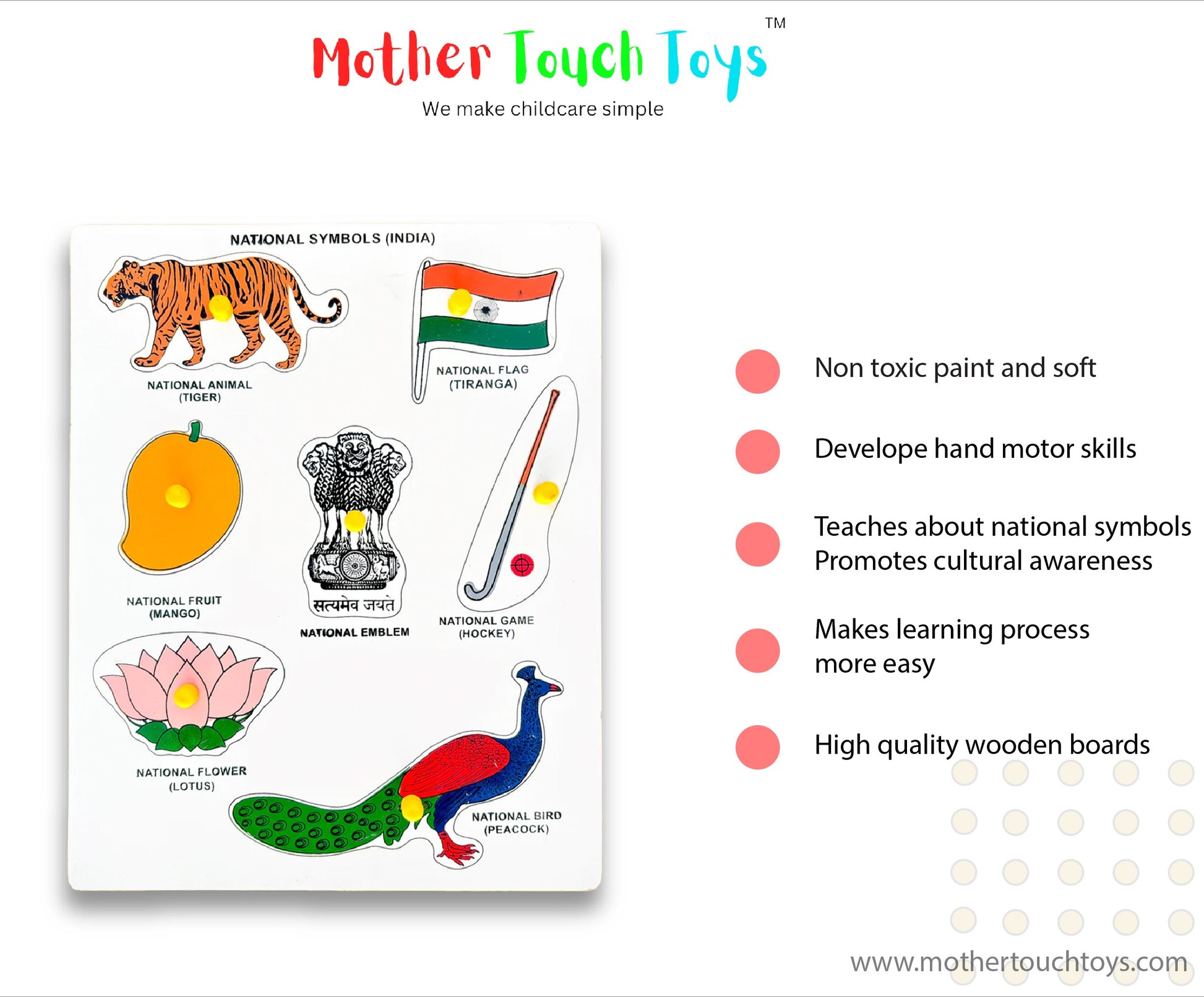 Learning Through Play: This puzzle is a delightful way for children to learn about India's national symbols in a fun and interactive way. Matching the pegs to the map helps children identify and memorize the symbols while fostering curiosity about India's rich culture and heritage.